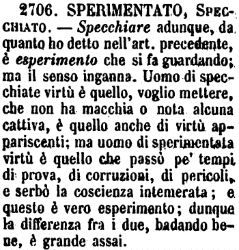| Sperimentato, Specchiato - Specchiare adunque, da quanto ho detto nell'art. precedente, è esperimento che si fa guardando; ma il senso inganna. Uomo di specchiate virtù è quello, voglio mettere, che non ha macchia o nota alcuna cattiva, è quello anche di virtù appariscenti; ma uomo di sperimentata virtù è quello che passò pe' tempi di prova, di corruzioni, di pericoli, e serbò la coscienza intemerata; e questo è vero esperimento; dunque la differenza fra i due, badando bene, è grande assai. [immagine] |