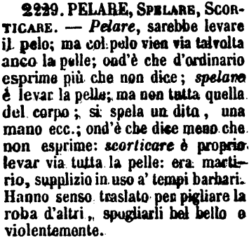 | Pelare, Spelare, Scorticare - Pelare, sarebbe levare il pelo; ma col pelo vien via talvolta anche la pelle; ond'è che d'ordinario esprime più che non dice; spelare è levar la pelle; ma non tutta quella del corpo; si spela un dito, una mano ecc.; ond'è che dice meno che non esprime: scorticare è proprio levar via tutta la pelle: era martirio, supplizio in uso a' tempi barbari. Hanno senso traslato per pigliare la roba d'altri, spogliarli bel bello e violentemente. [immagine] |