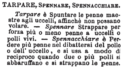| Tarpare, Spennare, Spennacchiare - Tarpare è Spuntare le penne maestre agli uccelli, affinchè non possano volare. - Spennare Strappare per forza più o meno penne a uccelli o polli vivi. - Spennacchiare è Perdere più penne nel dibattersi del pollo o dell'uccello, e si usa a modo di reciproco quando due o più polli si abbaruffano e si strappano le penne. [immagine] |