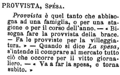 | Provvista, Spesa - Provvista è quel tanto che abbisogna ad una famiglia, o per una stagione o per il corso dell'anno. - «Bisogna fare la provvista della brace. - Fa le provviste per la villeggiatura.» - Quando si dice La spesa, s'intende il comprare al mercato tutto ciò che occorre per il vitto giornaliero. - «Va a far la spesa, e torna subito.» [immagine] |