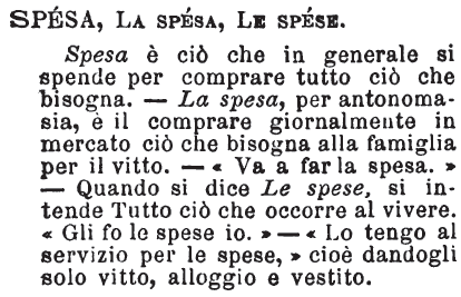 | Spesa, La spesa, Le spese - Spesa è ciò che in generale si spende per comprare tutto ciò che bisogna. - La spesa, per antonomasia, è il comprare giornalmente in mercato ciò che bisogna alla famiglia per il vitto. - «Va a far la spesa.» - Quando si dice Le spese, si intende Tutto ciò che occorre al vivere. «Gli fo le spese io.» - «Lo tengo al servizio per le spese,» cioè dandogli solo vitto, alloggio e vestito. [immagine] |