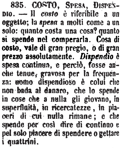 | Costo, Spesa, Dispendio - Il costo è riferibile a un oggetto; la spesa a molti come a un solo: quanto costa una cosa? quanto si spende nel comperarla. Cosa di costo, vale di gran pregio, o di gran prezzo assolutamente. Dispendio è spesa continua, e perciò, fosse anche tenue, gravosa per la frequenza: uomo dispendioso è colui che non bada al danaro, che lo spende in cose che a nulla gli giovano, in superfluità, in ricercatezze, in piaceri di cui nulla rimane; e che spende per così dire di continuo e pel solo piacere di spendere o gettare i quattrini. [immagine] |