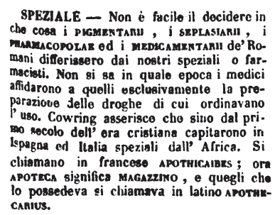 | Speziale - Non è facile il decidere in che cosa i pigmentarii, i seplasiarii, i pharmacopolae ed i medicamentarii de' Romani differissero dai nostri speziali o farmacisti. Non si sa in quale epoca i medici affidarono a quelli esclusivamente la preparazione delle droghe di cui ordinavano l'uso. Cowring asserisce che sino dal primo secolo dell'era cristiana capitarono in Ispagna ed Italia speziali dall'Africa. Si chiamano in francese apothicaibes; ora apoteca significa magazzino, e quegli che lo possedeva si chiamava in latino apothecarius. [immagine] |