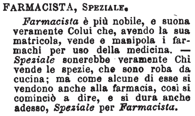 | Farmacista, Speziale - Farmacista è più nobile, e suona veramente Colui che, avendo la sua matricola, vende e manipola i farmachi per uso della medicina. - Speziale sonerebbe veramente Chi vende le spezie, che sono roba da cucina; ma come alcune di esse si vendono anche alla farmacia, così si cominciò a dire, e si dura anche adesso, Speziale per Farmacista. [immagine] |