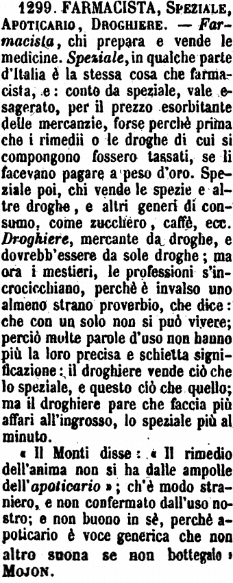 | Farmacista, Speziale, Apoticario, Droghiere - Farmacista, chi prepara e vende le medicine. Speziale, in qualche parte d'Italia è la stessa cosa che farmacista, e: conto da speziale, vale esagerato, per il prezzo esorbitante delle mercanzie, forse perchè prima che i rimedii o le droghe di cui si compongono fossero tassati, se li facevano pagare a peso d'oro. Speziale poi, chi vende le spezie e altre droghe, e altri generi di consumo, come zucchero, caffè, ecc. Droghiere, mercante da droghe, e dovrebb'essere da sole droghe; ma ora i mestieri, le professioni s'incrocicchiano, perchè è invalso uno almeno stano proverbio, che dice: che con un solo non si può vivere; perciò molte parole d'uso non hanno più la loro precisa e schietta significazione: il droghiere vende ciò che lo speziale, e questo ciò che quello; ma il droghiere pare che faccia più affari all'ingrosso, lo speziale più al minuto.