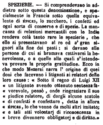 | Spezierie - Si comprendevano in addietro sotto questa denominazione, e specialmente in Francia sotto quella equivalente di épices, lo zucchero, i confetti ed ogni sorta di conserve e di spezie. La mancanza di relazioni mercantili con le Indie rendeva colà tanto rare le spezierie, che elle si presentavano al re ed a' gran signori alla fine dei pasti; si davano alle persone di cui si bramava cattivarsi la benevolenza, o a quelle alle quali s'intendeva provare la propria gratidudine. Ecco in che modo Mezerai narra l'origine di quei doni che facevano i litiganti ai relatori delle loro cause: «Sotto il regno di Luigi XII un litigante avendo ottenuto sentenza favorevole, pensò, onde ringraziare il suo giudice relatore, di dargli alcune scatole di confetti e confetture, dette in allora épices, lo che venne da molti altri imitato; e tali atti volontarj di riconoscenza in breve divennero obbligatorj e di diritto.» [immagine] |