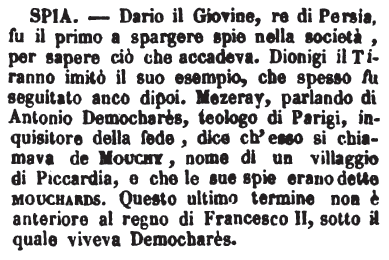 | Spia - Dario il Giovine, re di Persia, fu il primo a spargere spie nella società, per sapere ciò che accadeva. Dionigi il Tiranno imitò il suo esempio, che spesso fu seguitato anco dipoi. Mezeray, parlando di Antonio Democharès, teologo di Parigi, inquisitore della fede, dice ch'esso si chiamava de Mouchy, nome di un villaggio di Piccardia, e che le sue spie erano dette mouchards. Questo ultimo termine non è anteriore al regno di Francesco II, sotto il quale viveva Democharès. [immagine] |
