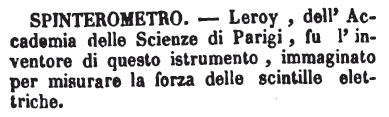 | Spinterometro - Leroy, dell'Accademia delle Scienze di Parigi, fu l'inventore di questo istrumento, immaginato per misurare la forza delle scintille elettriche. [immagine] |