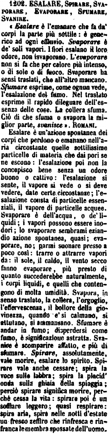 Esalare, Spirare, Svaporare, Evaporare, Sfumare, Svanire - «Esalare è l'emanare che fa da' corpi la parte più sottile: è generico ad ogni effluvio. Svaporare è de' soli vapori. I fiori esalano il loro odore, non isvaporano. L'evaporare non si fa che per calore più intenso, o di sole o di fuoco. Svaporare ha sensi traslati, che all'altro mancano. Sfumare esprime, come ognun vede, l'esalazione del fumo. Nel traslato esprime il rapido dileguare dell'essenza delle cose. La collera sfuma. Ciò di che sfuma o svapora la miglior parte, svanisce». Romani.