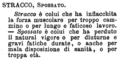 | Stracco, Spossato - Stracco è colui che ha infiacchita la forza muscolare per troppo cammino o per lungo e faticoso lavoro. - Spossato è colui che ha perduto il natural vigore o per diuturne e gravi fatiche durate, o anche per mala disposizione di sanità, o per troppa età. [immagine] |