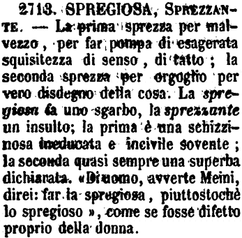 | Spregiosa, Sprezzante - La prima sprezza per malvezzo, per far pompa di esagerata squisitezza di senso, di tatto; la seconda sprezza per orgoglio per vero disdegno della cosa. La spregiosa fa sgarbo, la sprezzante un insulto; la prima è una schizzinosa ineducata e incivile sovente; la seconda quasi sempre una superba dichiarata. « Di uomo, avverte Meini, direi: far la spregiosa, piuttostochè lo spregioso », come se fosse difetto proprio della donna. [immagine] |