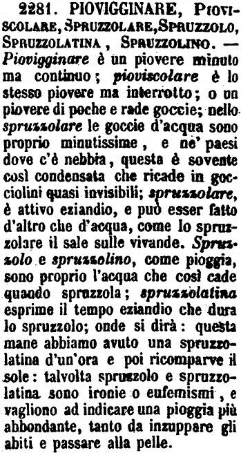 | Piovigginare, Pioviscolare, Spruzzolare, Spruzzolo, Spruzzolatina, Spruzzolino - Piovigginare è un piovere minuto ma continuo; pioviscolare è lo stesso piovere ma interrotto; o un piovere di poche e rade goccie; nello spruzzolare le goccie d'acqua sono proprio minutissime, e ne' paesi dove c'è nebbia, questa è sovente così condensata che ricade in gocciolini quasi invisibili; spruzzolare, è attivo eziandio, e può esser fatto d'altro che d'acqua, come lo spruzzolare il sale sulle vivande. Spruzzolo e spruzzolino, come pioggia, sono proprio l'acqua che così cade quando spruzzola; spruzzolatina esprime il tempo eziandio che dura lo spruzzolo; onde si dirà: questa mane abbiamo avuto una spruzzolatina d'un'ora e poi ricomparve il sole: talvolta spruzzolo e spruzzolatina sono ironie o eufemismi, e vagliono ad indicare una pioggia più abbondante, tanto da inzuppare gli abiti e passare alla pelle. [immagine] |