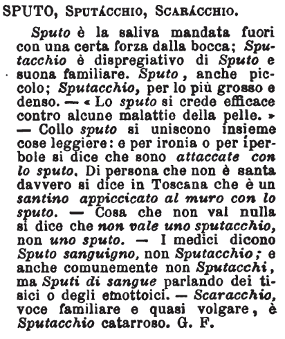 | Sputo, Sputacchio, Scaracchio - Sputo è la saliva mandata fuori con una certa forza dalla bocca; Sputacchio è dispregiativo di Sputo e suona familiare. Sputo, anche piccolo; Sputacchio, per lo più grosso e denso. - «Lo sputo si crede efficace contro alcune malattie della pelle.» - Collo sputo si uniscono insieme cose leggiere: e per ironia o per iperbole si dice che sono attaccate con lo sputo. Di persona che non è santa davvero si dice in Toscana che è un santino appiccicato al muro con lo sputo. - Cosa che non val nulla si dice che non vale uno sputacchio, non uno sputo. - I medici dicono Sputo sanguigno, non Sputacchio; e anche comunemente non Sputacchi, ma Sputi di sangue parlando dei tisici o degli emottoici. - Scaracchio, voce familiare e quasi volgare, è Sputacchio catarroso. G. F. [immagine] |