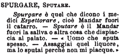 | Spurgare, Sputare - Spurgare è quel che dicono i medici Espettorare, cioè Mandar fuori il catarro. - Sputare è il Mandar fuori la saliva o altra cosa che dispiaccia al palato. - «Uomo che sputa spesso. - Assaggiai quel liquore, ma lo sputai perchè non mi piacque.» [immagine] |