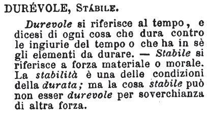 | Durevole, Stabile - Durevole si riferisce al tempo, e dicesi di ogni cosa che dura contro le ingiurie del tempo o che ha in sè gli elementi da durare. - Stabile si riferisce a forza materiale o morale. La stabilità è una delle condizioni della durata; ma la cosa stabile può non esser durevole per soverchianza di altra forza. [immagine] |