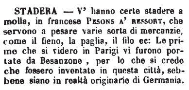 | Stadera - V'hanno certe stadere a molla, in francese Pesons a' ressort, che servono a pesare varie sorta di mercanzie, come il fieno, la paglia, il filo ec: Le prime che si videro in Parigi vi furono portate da Besanzone, per lo che si crede che fossero inventate in questa città, sebbene siano in realtà originarie di Germania. [immagine] |