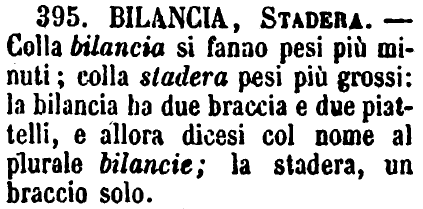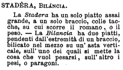 | Bilancia, Stadera - Colla bilancia si fanno pesi più minuti; colla stadera pesi più grossi: la bilancia ha due braccia e due piattelli, e allora dicesi col nome al plurale bilancie; la stadera, un braccio solo. [immagine] |