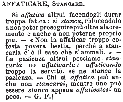 | Affaticare, Stancare - Si affatica altrui facendogli durar troppa fatica; si stanca, riducendolo a non poter proseguire più oltre alacremente e anche a non poterne proprio più. - «Non la affaticar troppo cotesta povera bestia, perchè a stancarla c'è il caso che s'ammali.» - La pazienza altrui possiamo stancarla no affaticarla: affaticando troppo la servitù, se ne stanca la pazienza. - Chi si affatica può anche non stancarsi, mentre uno può essere stanco appena affaticatosi un poco. - G. F.] [immagine] |