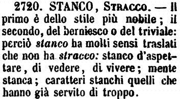 | Stanco, Stracco - Il primo è dello stile più nobile; il secondo, del berniesco o del triviale; perciò stanco ha molti sensi traslati che non ha stracco: stanco d'aspettare, di vedere, di vivere; mente stanca; caratteri stanchi quelli che hanno già servito di troppo. [immagine] |