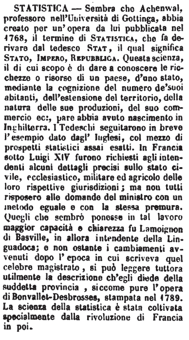 | Statistica - Sembra che Achenwal, professore nell'Università di Gottinga, abbia creato per un'opera da lui pubblicata nel 1768, il termine di Statistica, che fa derivare dal tedesco Stat, il qual significa Stato, Impero, Repubblica. Questa scienza, il di cui scopo è di dare a conoscere le ricchezze o risorse di un paese, d'uno stato, mediante la cognizione del numero de' suoi abitanti, dell'estensione del territorio, della natura delle sue produzioni, del suo commercio ec:, pare abbia avuto nascimento in Inghilterra. I Tedeschi seguitarono in breve l'esempio dato dagl'Inglesi, col mezzo di prospetti statistici assai esatti. In Francia sotto Luigi XIV furono richiesti agli intendenti alcuni dettagli precisi sullo stato civile, ecclesiastico, militare ed agricolo delle loro rispettive giurisdizioni; ma non tutti risposero alle domande del ministro con un metodo eguale e con la stessa premura. Quegli che sembrò ponesse in tal lavoro maggior capacità e chiarezza fu Lamoignon di Basville, in allora intendente della Linguadoca; e non ostante i cambiamenti avvenuti dopo l'epoca in cui scriveva quel celebre magistrato, si può leggere tuttora utilmente la descrizione ch'egli diede della suddetta provincia, siccome pure l'opera di Bonvallet-Desbrosses, stampata nel 1789. La scienza della statistica è stata coltivata specialmente dalla rivoluzione di Francia in poi. [immagine] |