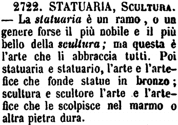 | Statuaria, Scultura - La statuaria è un ramo, o un genere forse il più nobile e il più bello della scultura; ma questa è l'arte che li abbraccia tutti. Poi statuaria e statuario, l'arte e l'artefice che fonde statue in bronzo; scultura e scultore l'arte e l'artefice che le scolpisce nel marmo o altra pietra dura. [immagine] |