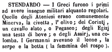 | Stendardo - I Greci furono i primi ad avere insegne militari alquanto regolari. Quelle degli Ateniesi erano comunemente Minerva, la civetta, l'olivo; dei Corintj, un cavallo alato, o Pegaseo; degli Egizj una testa di bove; e degli Assirj, una colomba. I Germanni avevano il leone, la serpe e la botta (la femmina del rospo). [immagine] |