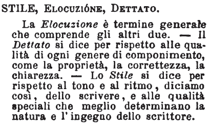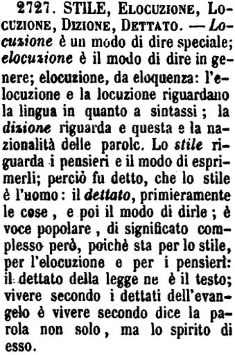 | Stile, Elocuzione, Dettato - La Elocuzione è termine generale che comprende gli altri due. - Il Dettato si dice per rispetto alle qualità di ogni genere di componimento, come la proprietà, la correttezza, la chiarezza. - Lo Stile si dice per rispetto al tono e al ritmo, diciamo così, dello scrivere, e alle qualità speciali che meglio determinano la natura e l'ingegno dello scrittore. [immagine] |
