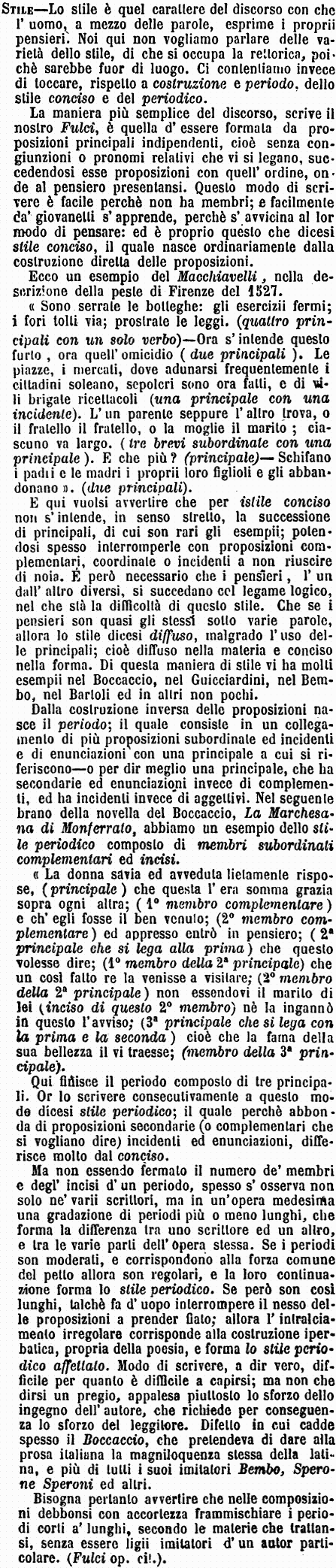| Stile - Lo stile è quel carattere del discorso con che l'uomo, a mezzo delle parole, esprime i proprii pensieri. Noi qui non vogliamo parlare delle varietà dello stile, di che si occupa la rettorica, poiché sarebbe fuor di luogo. Ci contentiamo invece di toccare, rispetto a costruzione e periodo, dello stile conciso e del periodico.