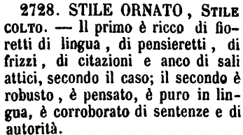 | Stile ornato, Stile colto - Il primo è ricco di fioretti di lingua, di pensieretti, di frizzi, di citazioni e anco di sali attici, secondo il caso; il secondo è robusto, è pensato, è puro in lingua, è corroborato di sentenze e di autorità. [immagine] |