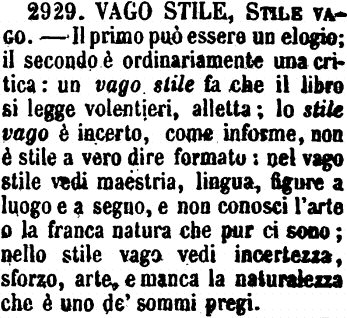| Vago stile, Stile vago - Il primo può essere un elogio; il secondo è ordinariamente una critica: un vago stile fa che il libro si legge volentieri, alletta; lo stile vago è incerto, come informe, non è stile a vero dire formato: nel vago stile vedi maestria, lingua, figure a luogo e a segno, e non conosci l'arte o la franca natura che pur ci sono; nello stile vago vedi incertezza, sforzo, arte, e manca la naturalezza che è uno de' sommi pregi. [immagine] |