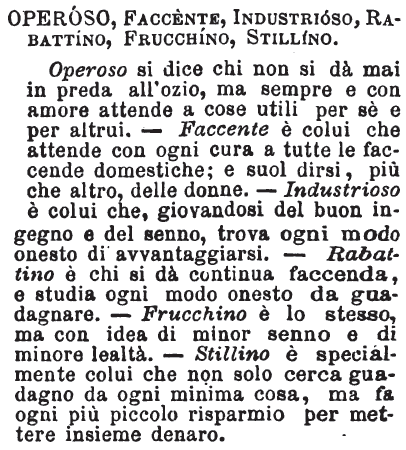 | Operoso, Faccente, Industrioso, Rabattino, Frucchino, Stillino - Operoso si dice chi non si dà mai in preda all'ozio, ma sempre e con amore attende a cose utili per sè e per altrui. - Faccente è colui che attende con ogni cura a tutte le faccende domestiche; e suol dirsi, più che altro, delle donne. - Industrioso è colui che, giovandosi del buon ingegno e del senno, trova ogni modo onesto di avvantaggiarsi. - Rabattino è chi si dà continua faccenda, e studia ogni modo onesto da guadagnare. - Frucchino è lo stesso, ma con idea di minor senno e di minore lealtà. - Stillino è specialmente colui che non solo cerca guadagno da ogni minima cosa, ma fa ogni più piccolo risparmio per mettere insieme denaro. [immagine] |