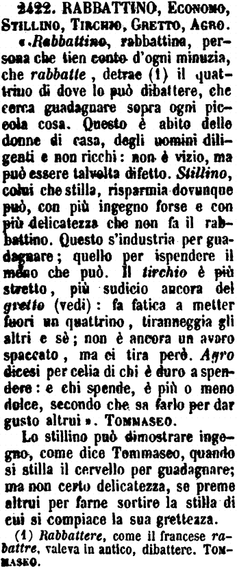 Rabbattino, Economo, Stillino, Tirchio, Gretto, Agro - «Rabbattino, rabbattina, persona che tien conto d'ogni minuzia, che rabbatte, detrae (1) il quattrino di dove lo può dibattere, che cerca guadagnare sopra ogni piccola cosa. Questo è abito delle donne di casa, degli uomini diligenti e non ricchi: non è vizio, ma può essere talvolta difetto. Stillino, colui che stilla, risparmia dovunque può, con più ingegno forse e con più delicatezza che non fa il rabbattino. Questo s'industria per guadagnare; quello per ispendere il meno che può. Il tirchio è più stretto, più sudicio ancora del gretto (vedi): fa fatica a metter fuori un quattrino, tiranneggia gli altri e sè; non è ancora un avaro spaccato, ma ci tira però. Agro dicesi per celia di chi è duro a spendere: e chi spende, è più o meno dolce, secondo che sa farlo per dar gusto altrui». Tommaseo.