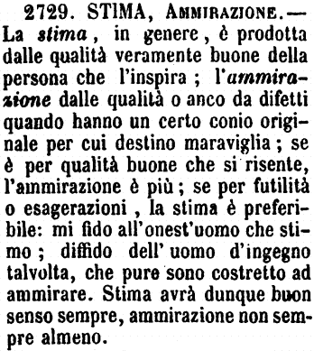| Stima, Ammirazione - La stima, in genere, è prodotta dalle qualità veramente buone della persona che l'inspira; l'ammirazione dalle qualità o anco da difetti quando hanno un certo conio originale per cui destino maraviglia; se è per qualità buone che si risente, l'ammirazione è più; se per futilità o esagerazioni, la stima è preferibile: mi fido all'onest'uomo che stimo; diffido dell'uomo d'ingegno talvolta, che pure sono costretto ad ammirare. Stima avrà dunque buon senso sempre, ammirazione non sempre almeno. [immagine] |