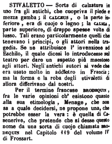 Per il termine francese brodequin, fra le varie opinioni ch'esistono quanto alla sua etimologia, Menage, che non sa a quale decidersi, ne propone una, che potrebbe esser la vera: è quella di Casenerive, che pretende che si desse questo nome da una sorta di cuojo chiamata brodequin nel Capitolo 119 del volume IV di Frossart. [immagine] |