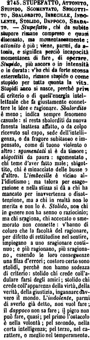| Stupefatto, Attonito, Stupido, Sgomentato, Sbigottimento, Sbalordito, Imbecille, Indolente, Stolido, Dappoco, Sbadato - Stupefatto, chi da subito stupore rimane compreso e quasi disensato, ma momentaneamente; attonito è più; viene, parmi, da atonia, e significa perciò incapacità momentanea di fare, di operare. Stupido, più ancora o in intensità o in durata: v'ha chi da forte scossa esterrefatto, rimane stupido o come stupido per tutta quanta la vita. Stupidi anco si nasce, perchè privi di criterio o di quell'energia intellettuale che fa giustamente connettere le idee e ragionare. Sbalordito è meno; indica sempre fenomeno casuale: si resta sbalorditi da nuova funesta inattesa affatto, o da colpo ricevuto sul capo, sede dell'intelligenza, o da fragore subitaneo e impensato, come di tuono violento o altro: sgomentati si è da timore; sbigottiti da paura: sgomentato, chi teme d'aver fatto male; sbigottito, chi è minacciato delle busse o d'altro. L'imbecille è vicino all'idiotismo; ma talora per esagerazione e nella stizza si dà a chi ha mancato per inavvertenza o disattenzione, ma a chi in realtà non lo merita e non lo è. Stolido, non chi in genere non ha senno o raziocinio; ma chi sragiona, chi accecato o smemorato non connette: v'anno di coloro che la facoltà del ragionare, per difetto di rettitudine nel sentire, impiegano a uno sragionare continuo; e più ragionano, più sragionano, essendo le loro conseguenze una filza d'errori; costoro certo sono stolidi, perchè non hanno sodezza di criterio: stolido chi crede coll'adulare farsi degli amici; stolido chi crede coll'apparenza della virtù, della verità, della giustizia, ingannare davvero il mondo. L'indolente, parmi di averlo già detto, non vuol fare; il dappoco non sa fare, il pigro non può fare, quasi; pel primo l'ostacolo è nella volontà; pel secondo, nella corta intelligenza; pel terzo, nel carattere, o meglio nel temperamento. [immagine] |
