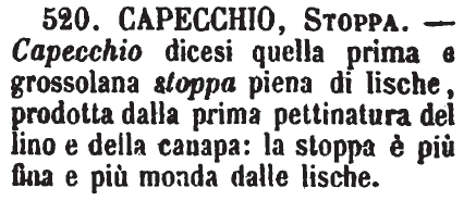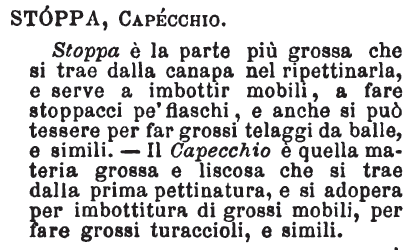 | Capecchio, Stoppa - Capecchio dicesi quella prima e grossolana stoppa piena di lische, prodotta dalla prima pettinatura del lino e della canapa: la stoppa è più fina e più monda dalle lische. [immagine] |