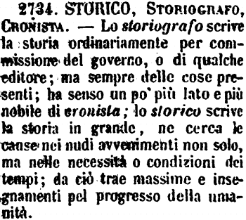 | Storico, Storiografo, Cronista - Lo storiografo scrive la storia ordinariamente per commissione del governo, o di qualche editore; ma sempre delle cose presenti; ha senso un po' più lato e più nobile di cronista; lo storico scrive la storia in grande, ne cerca le cause nei nudi avvenimenti non solo, ma nelle necessità o condizioni dei tempi; da ciò trae massime e insegnamenti pel progresso della umanità. [immagine] |