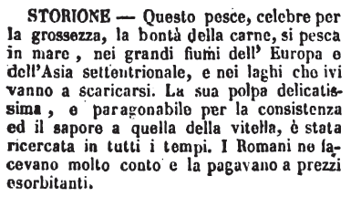 | Storione - Questo pesce, celebre per la grossezza, la bontà della carne, si pesca in mare, nei grandi fiumi dell'Europa e dell'Asia settentrionele, e nei laghi che ivi vanno a scaricarsi. La sua polpa delicatissima, e paragonabile per la consistenza ed il sapore a quella della vitella, è stata ricercata in tutti i tempi. I Romani ne facevano molto conto e la pagavano a prezzi esorbitanti. [immagine] |
