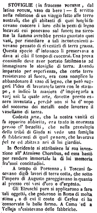 | Stoviglie - (in francese poterie, dal latino potum, vaso da bere) - E' scritto nella relazione di un viaggio fatto alle terre australi, che gli abitanti di quei luoghi facevano cuocere i loro cibi in pezzi di legno incavati cui ponevano sul fuoco; ma siccome la fiamma avrebbe presto guastato quei vasi, per rimediare a tali inconvenienti avevano pensato di rivestirli di terra grassa. Questa specie d'intonaco li preservava e dava ai cibi il tempo di cuocersi. Una prova consimile deve aver portato facilmene ad immaginare le stoviglie di terra. Avendo imparato per esperienza, che certe terre resistevano al fuoco, era cosa semplice lo abbandonare il vaso di legno, che però suggerì l'idea di lavorare la terra con le stampe, e indicò la maniera d'impiegarla a varj usi: la quale arte, dovette presto essere inventata, perchè non si ha d'uopo del soccorso dei metalli onde lavorare il vasellame di terra.