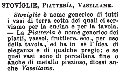 | Stoviglie, Piatteria, Vasellame - Stoviglie è nome generico di tutti i vasi di terra cotta dei quali ci serviamo per la cucina e per la tavola. - La Piatteria è nome generico dei piatti, vassoi, fruttiere. ecc., per uso della tavola, ed ha in sè l'idea di eleganza e di qualche pregio; e se quei vasi sono di porcellana fine o anche di metallo prezioso, dicesi anche Vasellame. [immagine] |