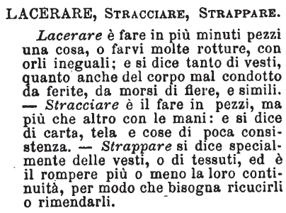 | Stracciare, Strappare, Lacerare - Stracciare si dice del fare i pezzi con le dita o carta, o altra cosa poco resistente. - Strappare si dice del rompere la continuità di un tessuto o facendone pezzi per forza di mano, o restando esso appiccato a qualche punta mentre ci moviamo. - Lacerare si dice del ridurre in minuti pezzi con forza di mano o panno o altro, e più specialmente delle membra umane straziate violentemente con armi taglienti, e anche da fiere. [immagine] |