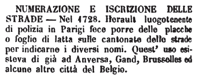 | Numerazione e iscrizione delle strade - Nel 1728. Herault luogotenente di polizia di Parigi fece porre delle placche o foglie di latta sulle cantonate delle strade per indicarne i diversi nomi. Quest'uso esisteva di già ad Anversa, Gand, Brusselles ed alcune altre città del Belgio. [immagine] |