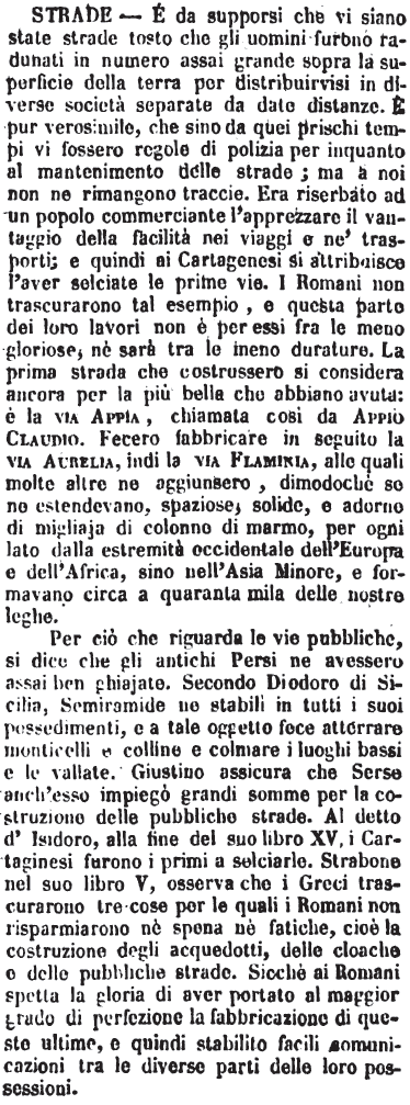 | Strade - E' da supporsi che vi siano state strade tosto che gli uomini furono radunati in numero assai grande sopra la superficie della terra per distribuirvisi in diverse società separate da date distanze. E' pur verosimile, che sino da quei prischi tempi vi fossero regole di polizia per inquanto al mantenimento delle strade; ma a noi non ne rimangono traccie. Era riserbato ad un popolo commerciante l'apprezzare il vantaggio della facilità nei viaggi e ne' trasporti; e quindi ai Cartagenesi si attribuisce l'aver selciate le prime vie. I Romani non trascurarono tal esempio, e questa parte dei loro lavori non è per essi fra le meno gloriose, nè sarà tra le meno durature. La prima strada che costrussero si considera ancora per la più bella che abbiano avuta: è la via Appia, chiamata così da Appio Claudio. Fecero fabbricare in seguito la via Aurelia, indi la via Flaminia, alle quali molte altre ne aggiunsero, dimodochè se ne estendevano, spaziose, solide, e adorne di migliaja di colonne di marmo, per ogni lato dalla estremità occidentale dell'Europa e dell'Africa, sino nell'Asia Minore, e formavano circa a quaranta mila delle nostre leghe.