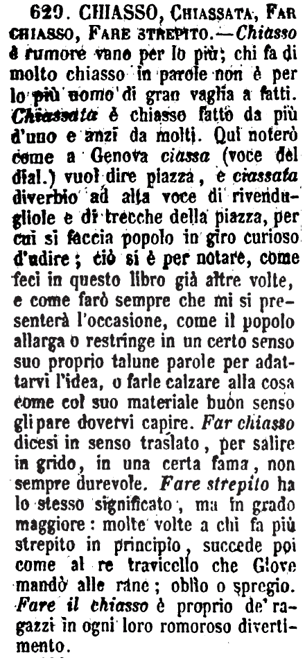| Chiasso, Chiassata, Far chiasso, Fare strepito - Chiasso è rumore vano per lo più; chi fa di molto chiasso in parole non è per lo più uomo di gran vaglia a fatti. Chiassata è chiasso fatto da più d’uno e anzi da molti. Qui noterò come a Genova ciassa (voce del dial.) vuol dire piazza, e ciassata diverbio ad alta voce di rivendugliole e di trecche della piazza, per cui si faccia popolo in giro curioso d’udire; ciò si è per notare, come feci in questo libro già altre volte, e come farò sempre che mi si presenterà l’occasione, come il popolo allarga o restringe in un certo senso suo proprio talune parole per adattarvi l’idea, o farle calzare alla cosa come col suo materiale buon senso gli pare dovervi capire. Far chiasso dicesi in senso traslato, per salire in grido, in una certa fama, non sempre durevole. Fare strepito ha lo stesso significato, ma in grado maggiore: molte volte a chi fa più strepito in principio, succede poi come al re travicello che Giove mandò alle rane; oblìo o spregio. Fare il chiasso è proprio de’ ragazzi in ogni loro romoroso divertimento. [immagine] |
