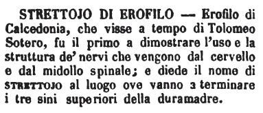 | Strettojo di erofilo - Erofilo di Calcedonia, che visse a tempo di Tolomeo Sotero, fu il primo a dimostrare l'uso e la struttura de' nervi che vengono dal cervello e dal midollo spinale; e diede il nome di strettojo al luogo ove vanno a terminare i tre sini superiori della duramadre. [immagine] |