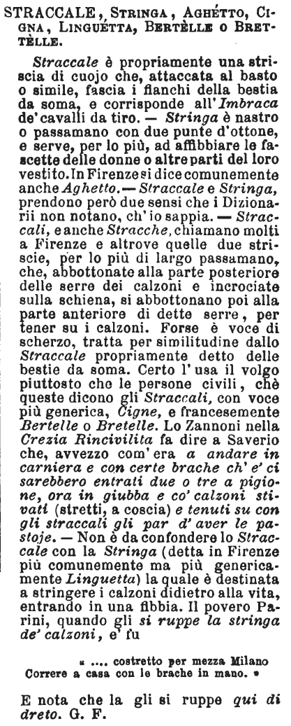 | Straccale, Stringa, Aghetto, Cigna, Linguetta, Bertelle o Bretelle - Straccale è propriamente una striscia di cuojo che, attaccata al basto o simile, fascia i fianchi della bestia da soma, e corrisponde all'Imbraca de' cavalli da tiro. - Stringa è nastro o passamano con due punte d'ottone, e serve, per lo più, ad affibbiare le fascette delle donne o altre parti del loro vestito. In Firenze si dice comunemente anche Aghetto. - Straccale e Stringa, prendono però due sensi che i Dizionari non notano, ch'io sappia. - Straccali, e anche Stracche, chiamano molti a Firenze e altrove quelle due striscie, per lo più di largo passamano, che, abbottonate alla parte posteriore delle serre dei calzoni e incrociate sulla schiena, si abbottonano poi alla parte anteriore di dette serre, per tener su i calzoni. Forse è voce di scherzo, tratta per similitudine dallo Straccale, propriamente detto delle bestie da soma. Certo l'usa il volgo piuttosto che le persone civili, chè queste dicono gli Straccali, con voce più generica, Cigne, e francesemente Bertelle o Bretelle. Lo Zannoni nella Crezia Rincivilita fa dire a Saverio che, avvezzo com'era a andare in carniera e con certe brache ch'e' ci sarebbero entrati due o tre a pigione, ora in giubba e co' calzoni stivati (stretti, a coscia) e tenuti su con gli straccali gli par d'aver le pastoje. - Non è da confondere lo Straccale con la Stringa (detta in Firenze più comunemente ma più genericamente Linguetta) la quale è destinata a stringere i calzoni didietro alla vita, entrando in una fibbia. Il povero Parini, quando gli si ruppe la stringa de' calzoni, e' fu