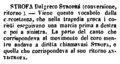 | Strofa - Dal greco Strophé (conversione, ritorno) - Viene questo vocabolo dalla circostanza, che nella tragedia greca i coristi eseguivano una marcia prima a destra e poi a sinistra. La parte del canto che corrispondeva al movimento del coro mentre andava a diritta chiamavasi Strofa, e quella che corrispondeva al suo ritorno Antistrofa. [immagine] |