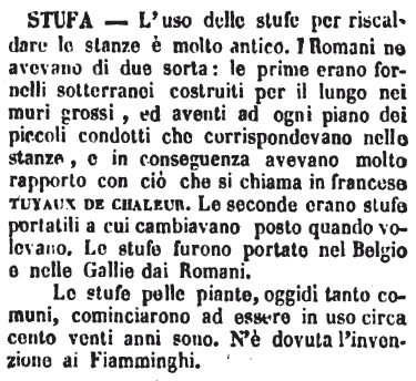 | Stufa - L'uso delle stufe per riscaldare le stanze è molto antico. I Romani ne avevano di due sorta: le prime erano fornelli sotterranei costruiti per il lungo nei muri grossi, ed aventi ad ogni piano dei piccoli condotti che corrispondevano nelle stanze, e in conseguenza avevano molto rapporto con ciò che si chiama in francese tuyaux de chaleur. Le seconde erano stufe portatili a cui cambiavano posto quando volevano. Le stufe furono portate nel Belgio e nelle Gallie dai Romani.