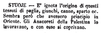 | Stuoje - E' ignota l'origine di questi tessuti di paglia, giunchi, canne, sparto ec. Sembra però che avessero principio in Oriente. Gli Anacoreti della Palestina le lavoravano, e con esse si coprivano. [immagine] |