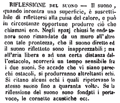 | Riflessione del suono - Il suono, quando incontra una superficie, è suscettibile di riflettersi alla guisa del calore, e può in circostanze opportune produrre ciò che chiamasi eco. Negli spazj chiusi le onde sonore sono rimandate da un muro all'altro con tale prontezza, che il suono diretto ed il suono riflettuto sono inapprezzabili; ma all'aria libera e ad una certa distanza dall'ostacolo, scorrerà un tempo sensibile fra i due suoni. Se accade che vi siano parecchi ostacoli, si produrranno altrettanti echi. Si citano alcuni echi i quali ripetevano lo stesso suono fino a quaranta volte. Su la riflessione del suono sono fondati i portavoce, le cornette acustiche, ec:. [immagine] |